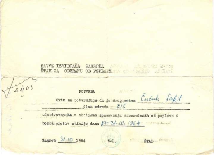Bili smo na čagi v Špajzi (tak je Bigi nazval dvoranu studentskog doma v Šarengradskoj) kad je šef sastava zaustavil glazbu i prek mikrofona objavil: “Sava je probila nasip”. Otišli smo doma v Ostrovičku, al niko ni mogel spat. Onda smo otišli kroz Dužice da pogledamo kak je prek autoputa (Zadarske ceste). A Knežija je bila pod vodom. Od kučih prek Salezijancih su se videli samo krovovi. Onda smo opet otišli doma spat. A onda je v Ostrovičku prek Dobojske, a od Savske, v četri v jutro grunula voda. Pobegli smo v gimnaziju. Tam sam videl moju susedu Jelu kak v rukama grčevito drži prazne aufingere. Sve kaj je bilo na njima je ostavila v kuči. Onda sam shvatil kaj je to panika. Čovek nezna kaj dela. Tak je bilo.